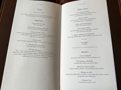 Er brachte den Pyjama zusammen mit der Speise und Getränkekarte aus der ich mir gerne schon einmal eine Vorspeise und einen Hauptgang aussuchen könne. Ich entschied mich zunächst erst einmal für den Kaviar, da das irgendwie typisch für die Fist Class ist. Und wie es der Zufall so will mag ich (guten) Kaviar sogar sehr gerne. Das passte also.