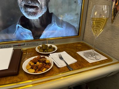 Direkt nach dem Start gab es das nächste Glas Champagner und dazu heiße Nüsse. Ich wurde gefragt, ob ich zu den Nüssen gerne dunkle oder helle Oliven hätte. Danke, gerne.