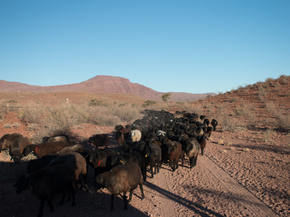 Während des Frühstücks kam Thomas zu unserem Stellplatz. Da er barfuß lief, haben wir ihn gar nicht bemerkt, bis er auf einmal an der Mauer stand. Da wir noch nicht fertig waren, nutzte er die Zeit, um ein Wasserloch in der Nähe zu überprüfen. Er erzählte uns dann viel über die Farm und das Gelände, sowie über die Malereien. Durch ein trockenes Flussbett, was nach Regenfällen nur selten Wasser führt, gingen wir eine Weile und Thomas erklärte uns viel über Pflanzen und Tiere, die wir unterwegs sahen.