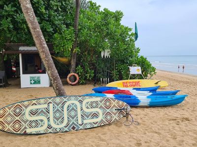 Strandhandtücher werden gestellt und es gibt kostenlos Wasser am Strand. Weitere Getränke kann man sich an der Strandbar holen, oder geht kurz zu einem der Restaurants außerhalb des Hotels. Hier kostet z.B. eine Dose Cola 30 Baht.